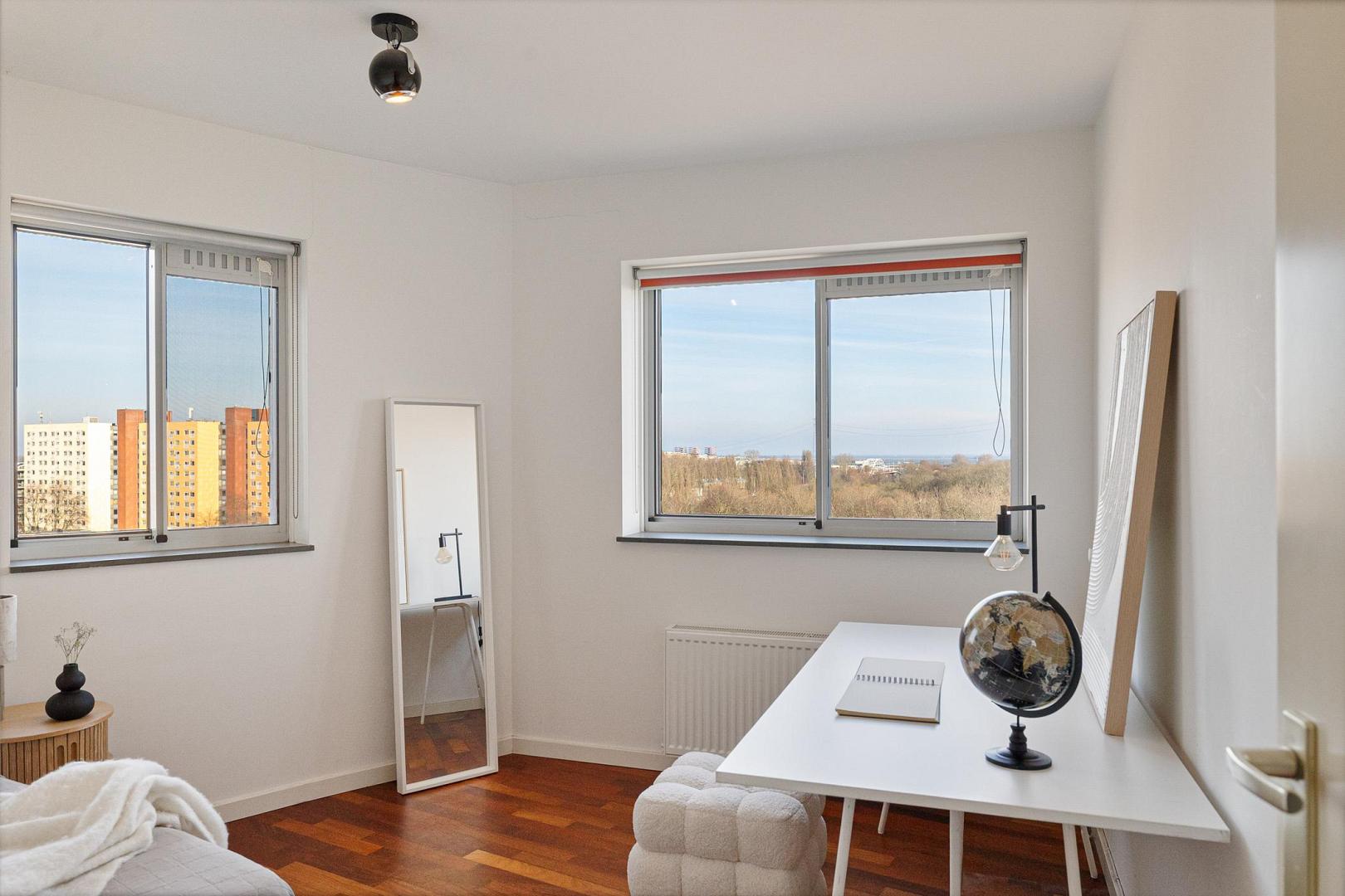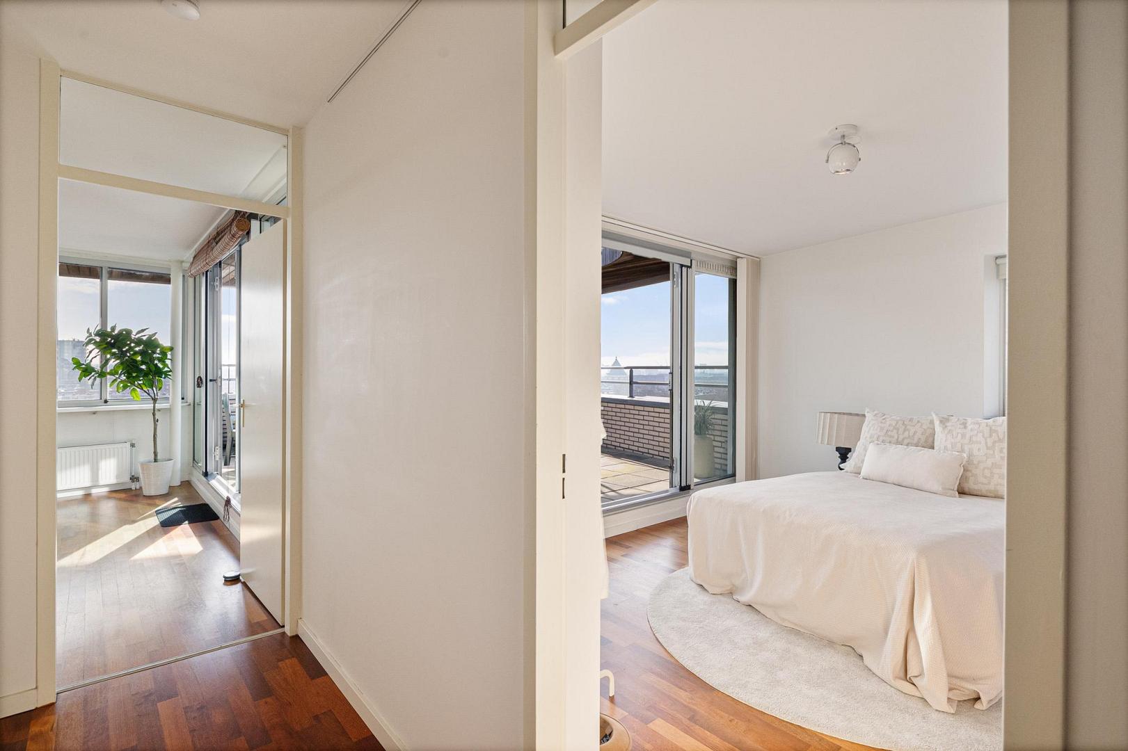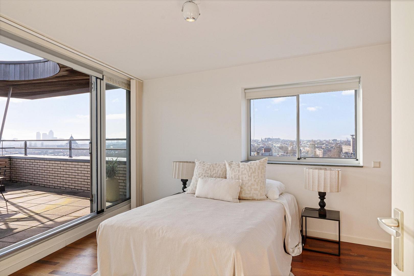 Het penthouse beschikt momenteel over twee slaapkamers: een royale hoofdslaapkamer met toegang tot het terras en een tweede, rustig gelegen slaapkamer aan de hal.