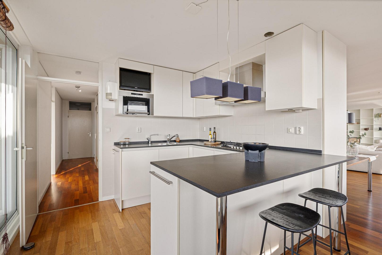 Aansluitend bevindt zich de open keuken, voorzien van diverse inbouwapparatuur.
