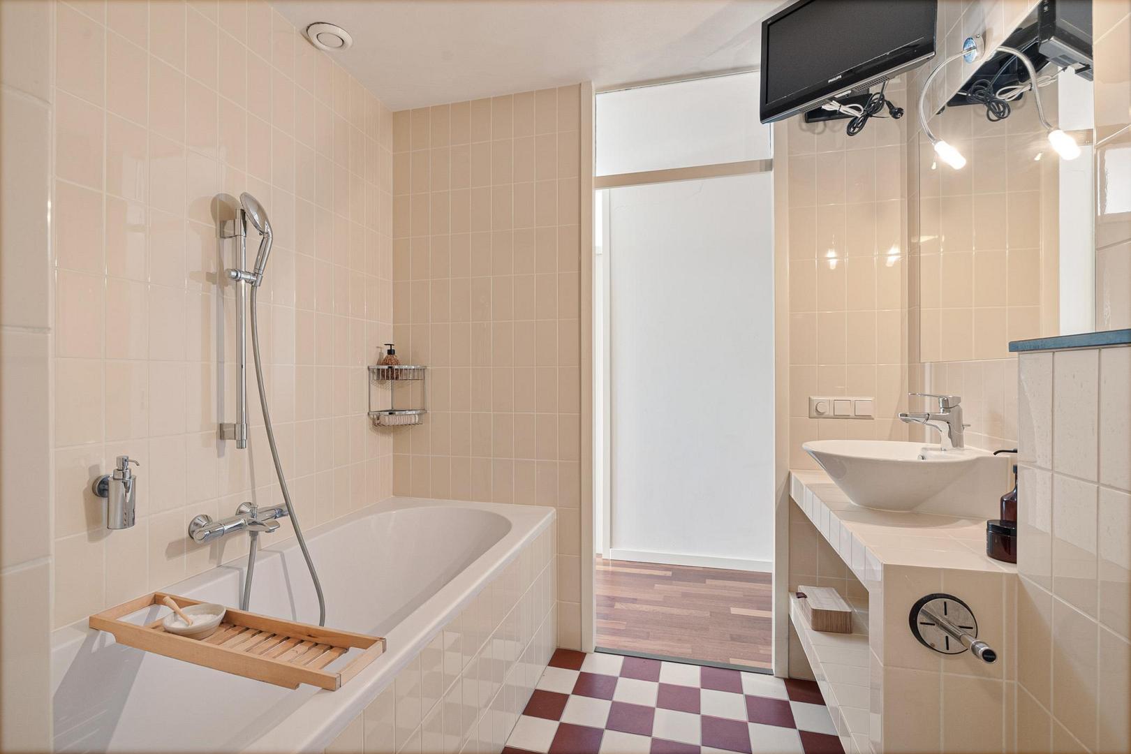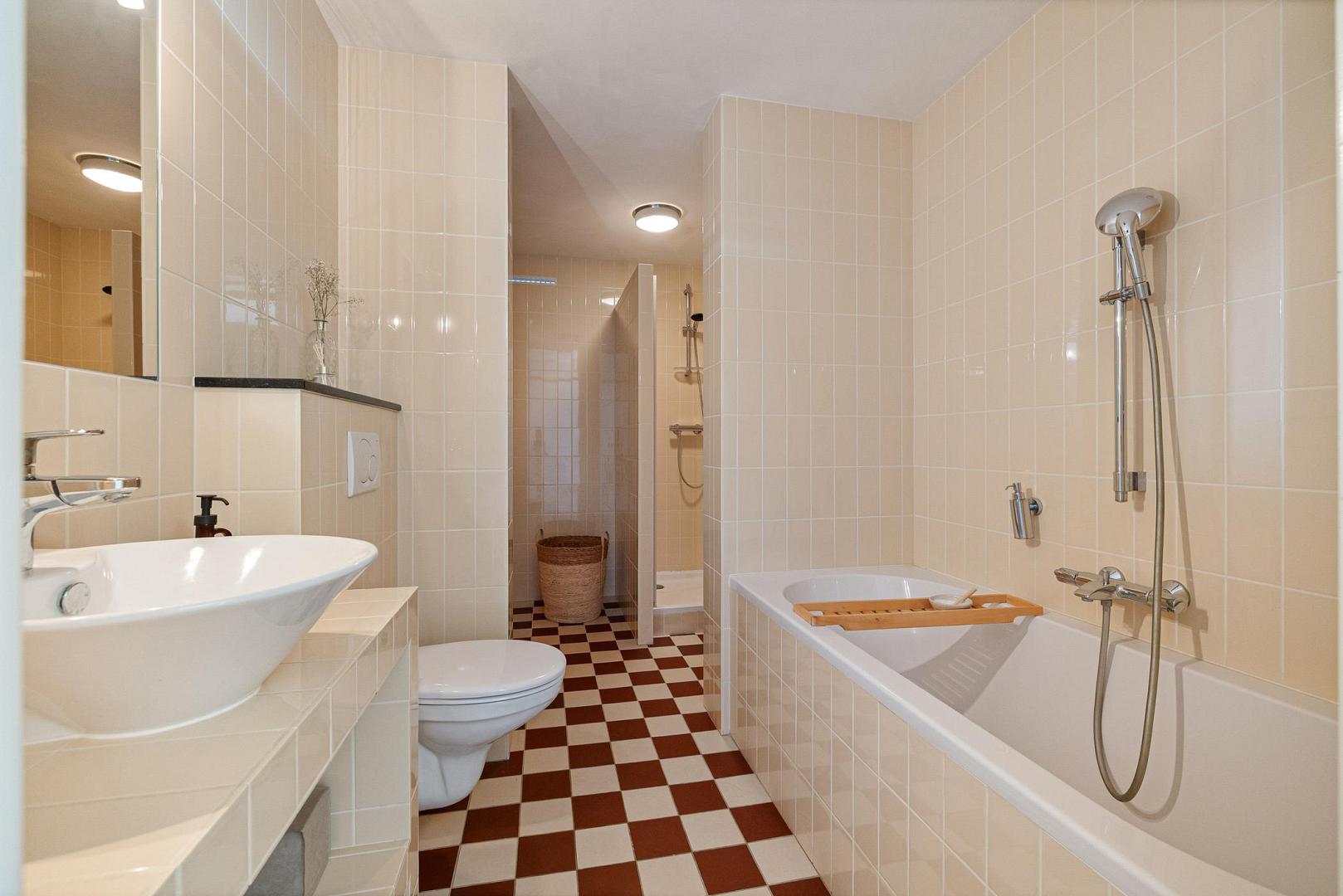 - Badkamer met ligbad, douche, bidet én toilet