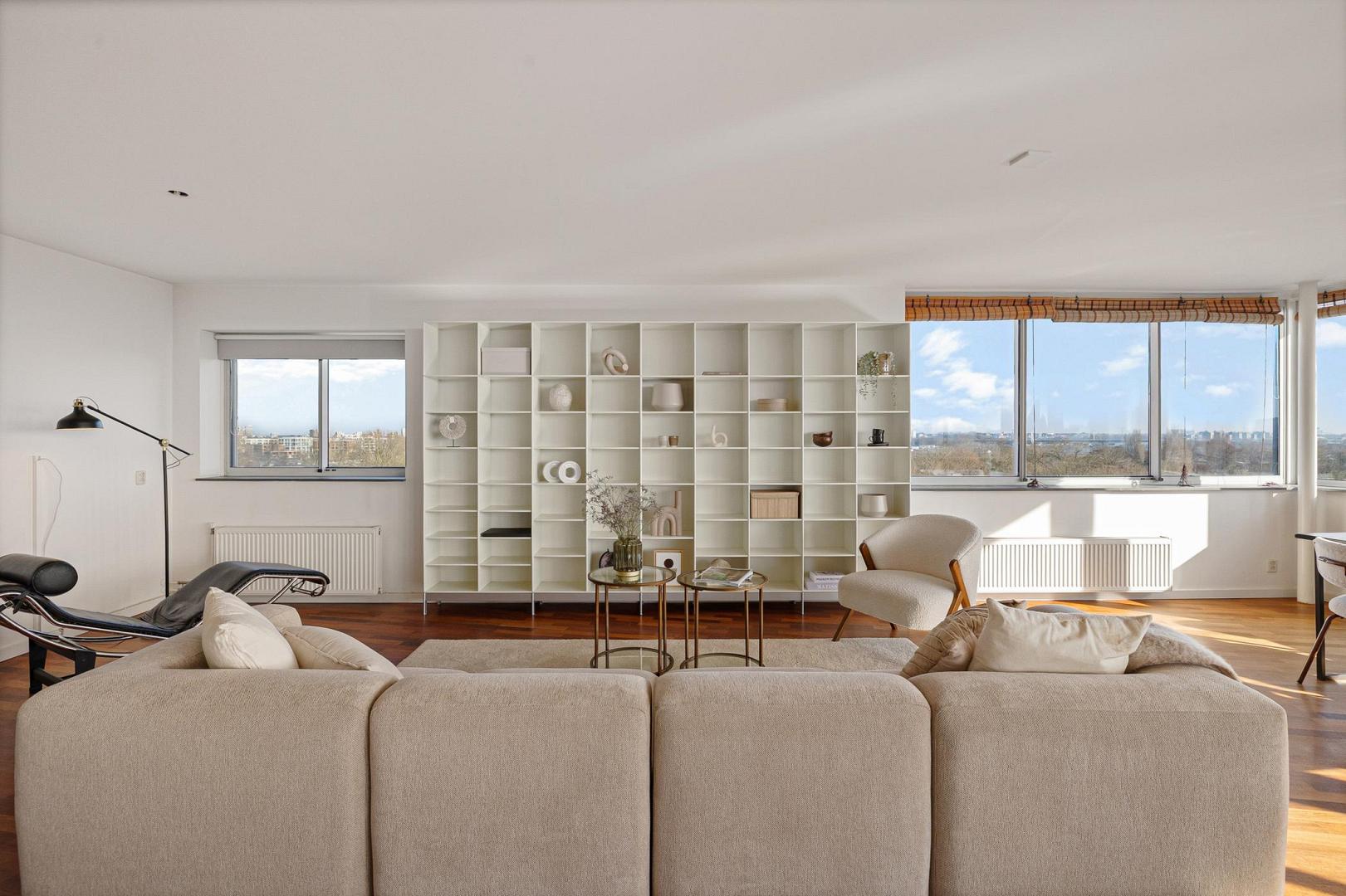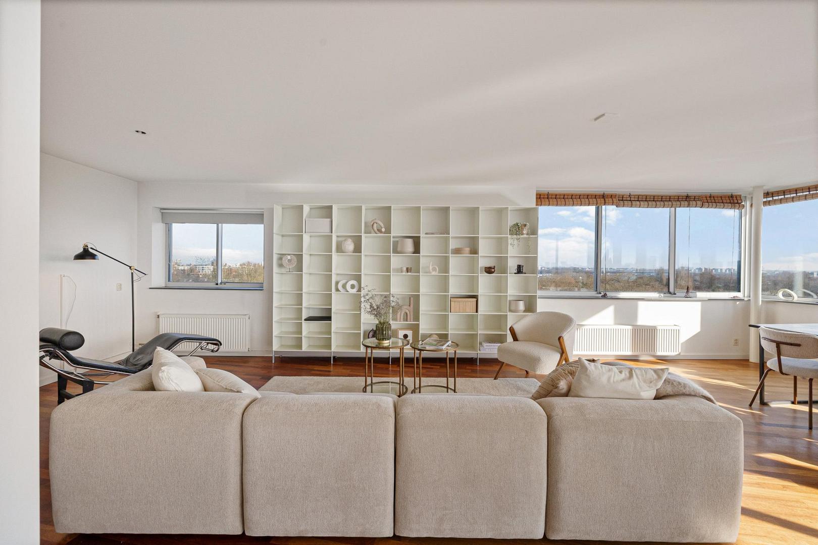 De royale woonkamer wordt gekenmerkt door grote, rondom geplaatste raampartijen die zorgen voor een indrukwekkend panoramisch uitzicht en een uitzonderlijke lichtinval gedurende de hele dag.