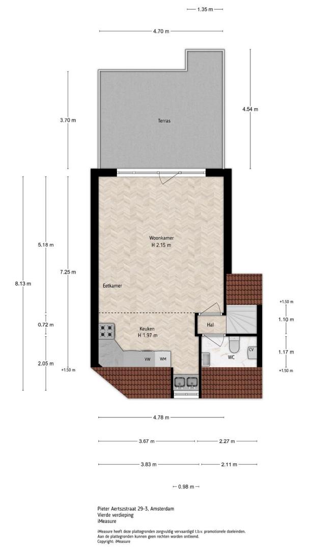 For more information, please visit our website. This two-storey townhouse boasts a rooftop terrace and is situated on freehold land. It has an approximate area of 112 m². This charming and highly versatile duplex penthouse is located in a quiet spot in the popular Pijp neighbourhood and is spread across the third and fourth floors. It features a spacious rooftop terrace and is situated on freehold land, which is a rare and valuable asset in this neighbourhood. The property is currently laid out in a practical manner, with the living area and kitchen on the fourth (attic) floor. This floor offers direct access to the sunny rooftop terrace and unobstructed views. Here, you can enjoy light, space and privacy right in the heart of the city. The third floor features the master bedroom with a small balcony at the front and the master bathroom. At the rear of the third floor is a separate two-room layout with its own living room, bedroom, balcony, bathroom and kitchen. This layout offers flexibility of use, for example for guests, working from home or other purposes within applicable regulations. The total living area is approximately 112 m² and the outdoor space is approximately 22 m². This property consists of two condominium units: A12: Third floor A13: Attic floor (fourth floor with rooftop terrace) Location The property is located in the heart of De Pijp, with the Albert Cuyp Market, shops, restaurants and Sarphati Park nearby. The North-South metro line and other public transport links are within walking distance. It is a surprisingly green and quiet street in a lively neighbourhood. Foundation condition/homeowners' association Foundation repairs have been carried out on the adjacent properties (Pieter Aertszstraat 29-O and 31) in the past. These repairs included the shared exterior walls on the left and right sides (in connection with the construction of basements). For the building in question, however, foundation repairs are still required to the front and rear façades and the middle wall. In 2023, the Homeowners’ Association drew up an indicative budget of approximately €210,000 (including VAT) for this purpose, though this amount still needs to be updated. Decisions regarding implementation, scheduling and final costs must still be made within the Homeowners’ Association. This future maintenance obligation has been taken into account when determining the asking price. In this context, studies and quotes have been requested to further identify the structural principles and possible next steps. The Homeowners’ Association is currently in a preparatory and exploratory phase. Final decisions regarding any measures, planning and associated costs have yet to be made. Prospective buyers are expressly advised to seek further information on this matter and to take this aspect into account when making their purchase decision. Details - Two-storey upper unit - Living area: approx. 112 m² - Roof terrace: approx. 19 m² - Rear balcony - A window in the side wall allows daylight to enter even the 'middle'. - Located on freehold land - Two apartment rights (A12 and A13). - Flexible layout This property offers a rare combination of space, outdoor living and a freehold location – ready for a new owner.Video